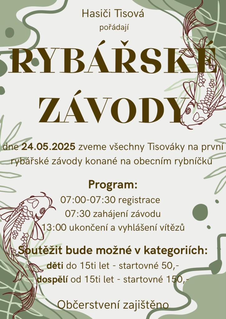 Hasiči Tisová srdečně zvou na první rybářské závody, které se uskuteční na obecním rybníčku. Tato akce slibuje skvělou zábavu a příležitost pro všechny milovníky rybaření. Nezapomeňte se zaregistrovat a připojte se k nám na tento jedinečný zážitek!