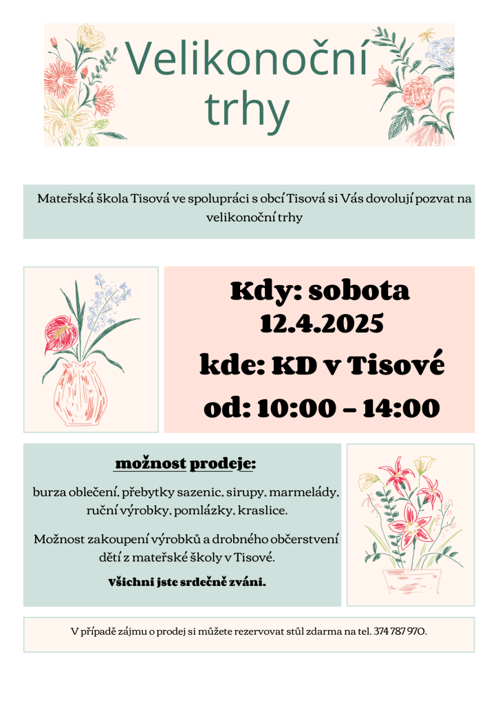 Mateřská škola Tisová ve spolupráci s obcí Tisová si Vás dovolují pozvat na velikonoční trhy.